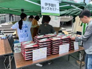 先日開催された、伊予銀行さんとの共同セミナーで誕生した「小学生が考案したオリジナル弁当」が本日マドンナスタジアムで販売され、25食×5グループ(125食)のお弁当が大変好評で、1時間ほどで完売しました!